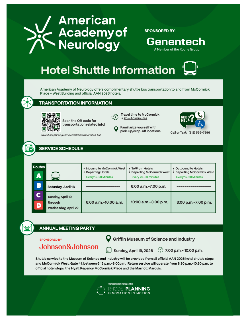 Shuttle service to the Museum of Science and Industry will be provided from all official AAN 2026 hotel shuttle stops between 6:15 PM - 8:00 PM.