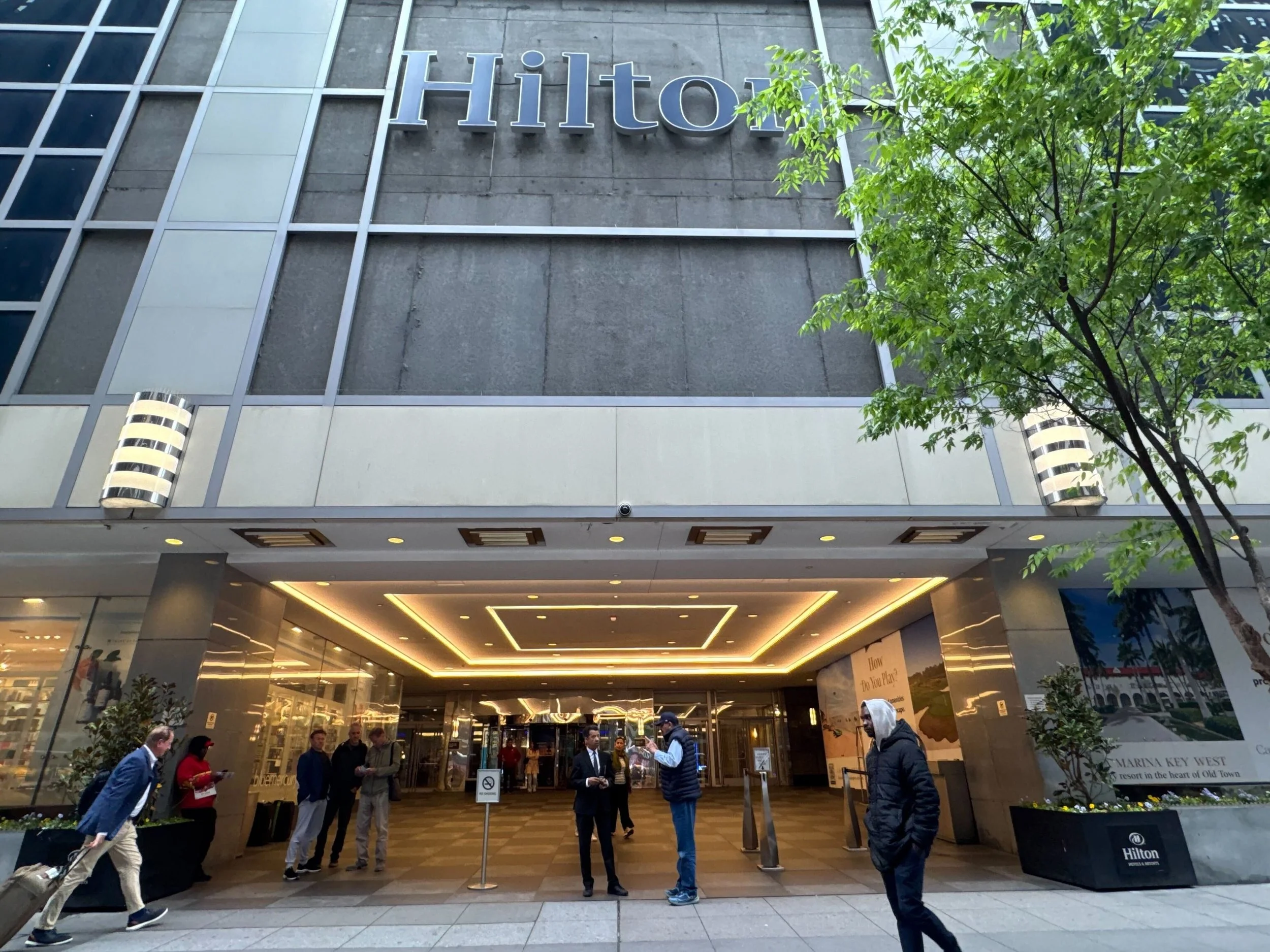 Tap on marker icons to preview shuttle stop signage and nearby hotel entrance.