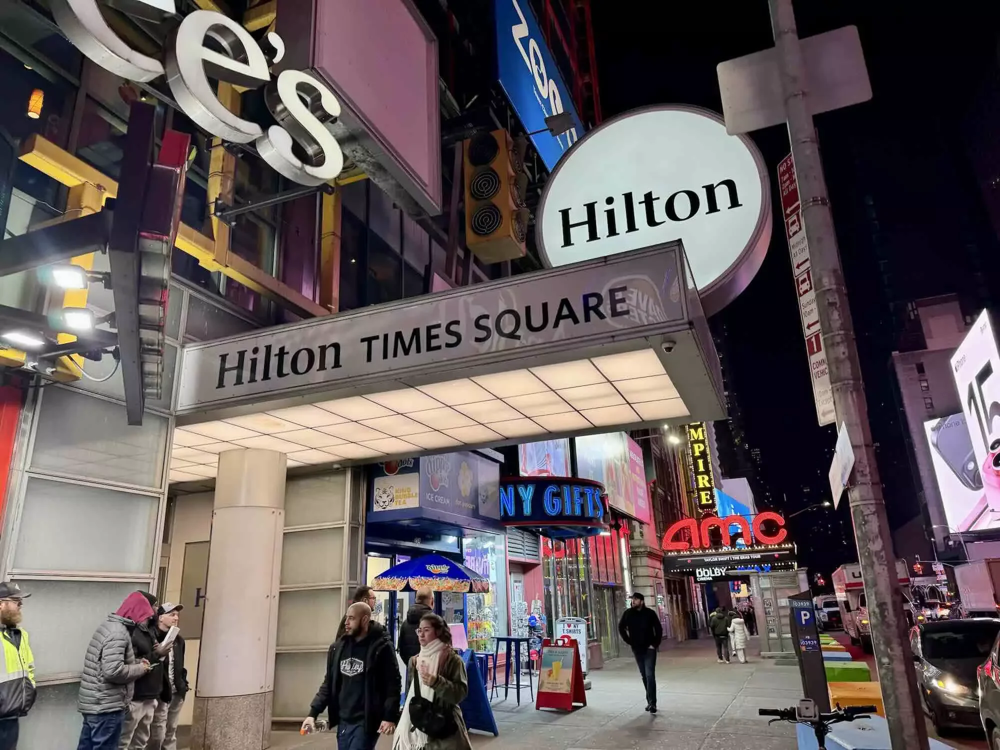 Tap on marker icons to preview shuttle stop signage and nearby hotel entrance.