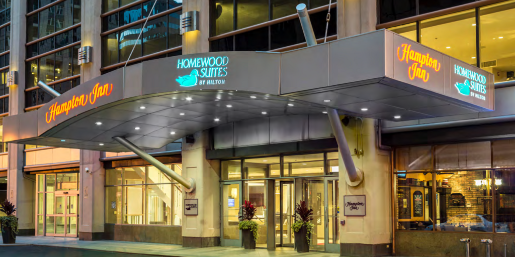 Tap on marker icons to preview shuttle stop signage and nearby hotel entrance.